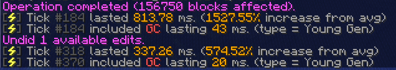As you can see, the ticks when the WorldEdit action was executing saw increases of over 1000%!